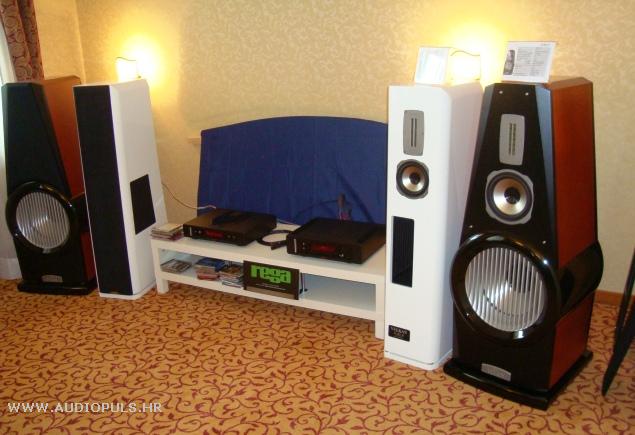 U idućoj sobi sviraju Rega Isis CD player i Rega Osiris integrirac, sve spojeno na meni nepoznate zvučnike (koji komotno mogu ponijeti titulu najrunijih zvučnika na sajmu). Svi koji me poznaju znaju koliko volim i cijenim Regu, radi se o firmi koja za nikakve novce daje maksimalno mnogo zvuka. Ali ovaj sustav nije svirao dobro. Zvuk je brz i detaljan, ali i metaličan, agresivan te mrav u basu.