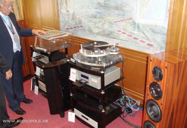 Slijede veliki Sound Lab zvučnici spojeni na referentni VYGER Indian Signature gramofon (koji izgleda kao Darf Tvader) te meni nepoznata pojačala.